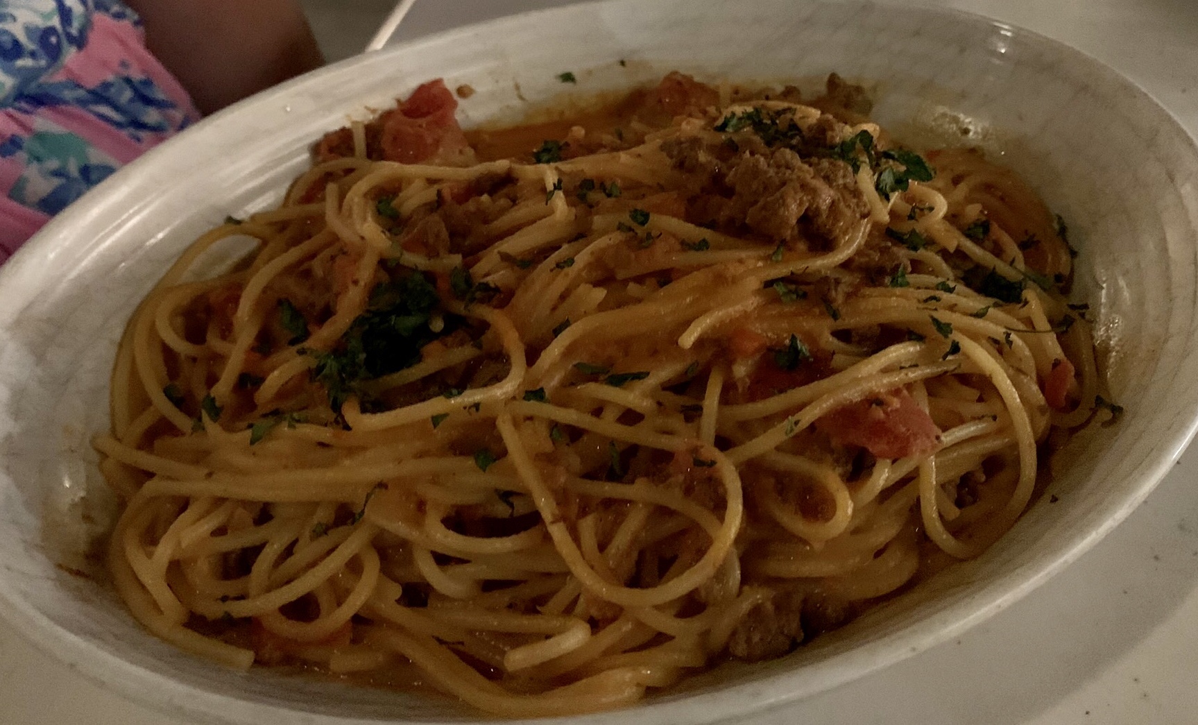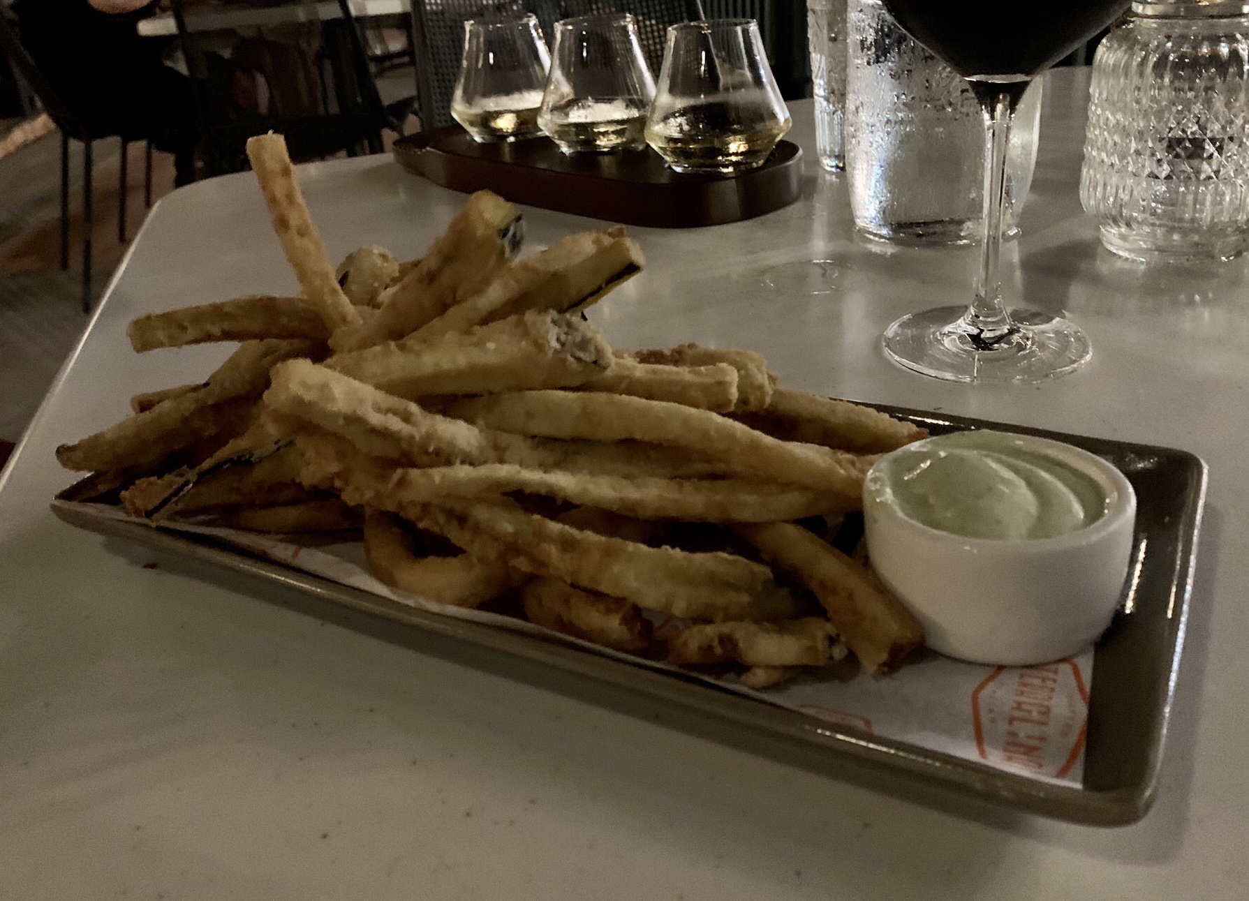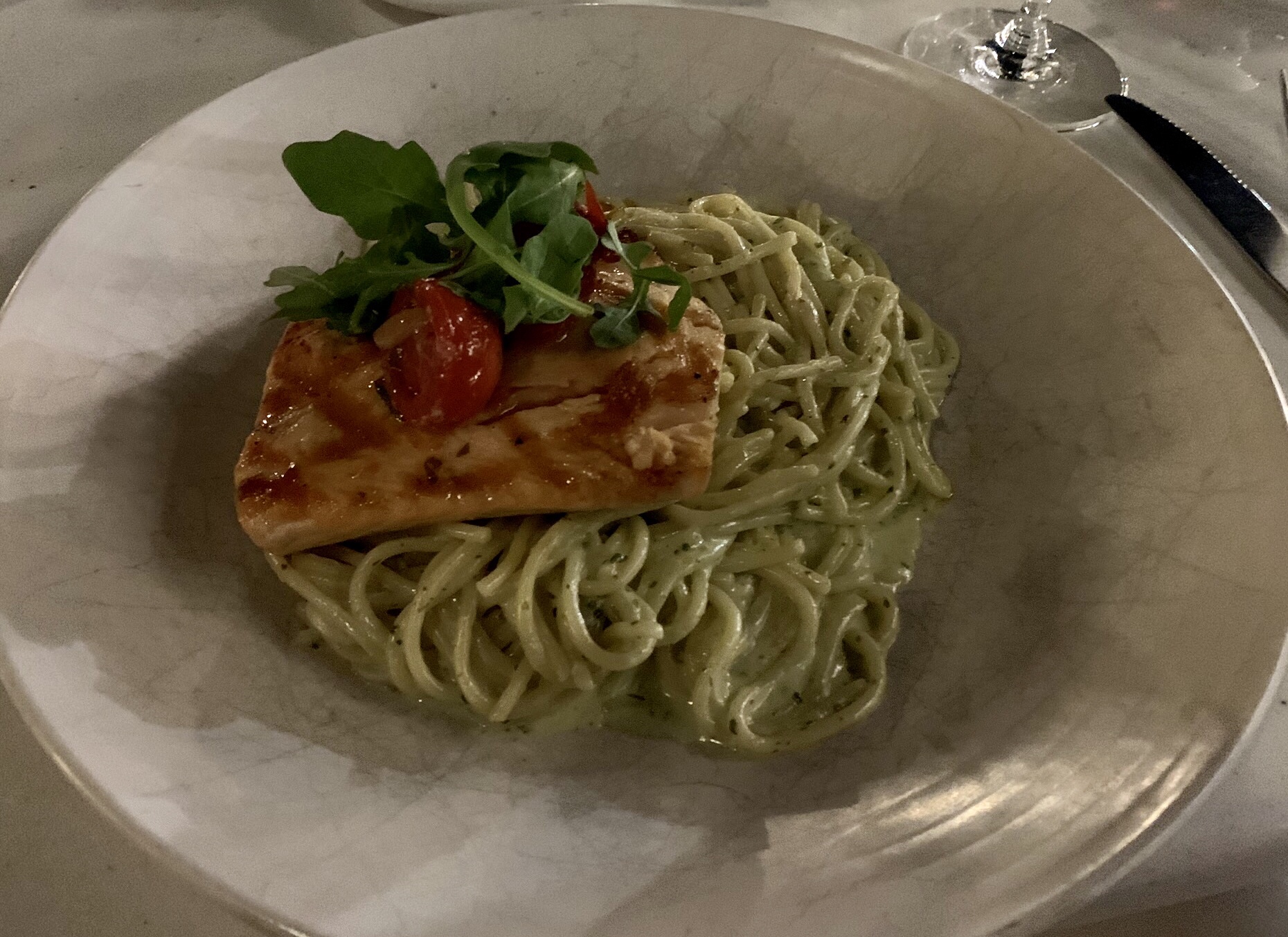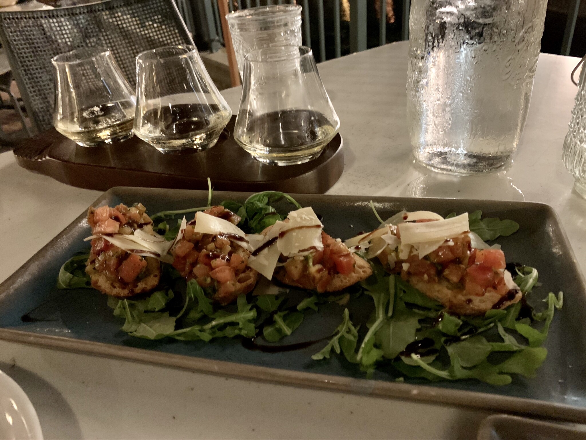 Our waiter was friendly, and we ordered our drinks. My wife ordered a white wine flight (which was good, but the glasses were a strange shape and she had trouble with them) and I ordered a nice red wine. For the appetizers we ordered the Crispy Eggplant Fries with lemon-caper aioli and the Bruschetta. Both were amazing so things were looking up. For the main course I ordered the catch of the day (which happened to be Salmon tonight) and my wife ordered Spaghetti Bolognese with beef, pork and pancetta meat sauce, tomato parmesan cream. They sounded excellent so we were excited (especially since this is a James Beard Award winning chef, Tony Mantuano). Apparently, he did not win the award for his food at Terralina because both main courses were just OK (sort of the food I would expect at Olive Garden for ½ the price). Neither meal was bad, or good and pretty bland. I get the feeling the Chef was not there this evening.
