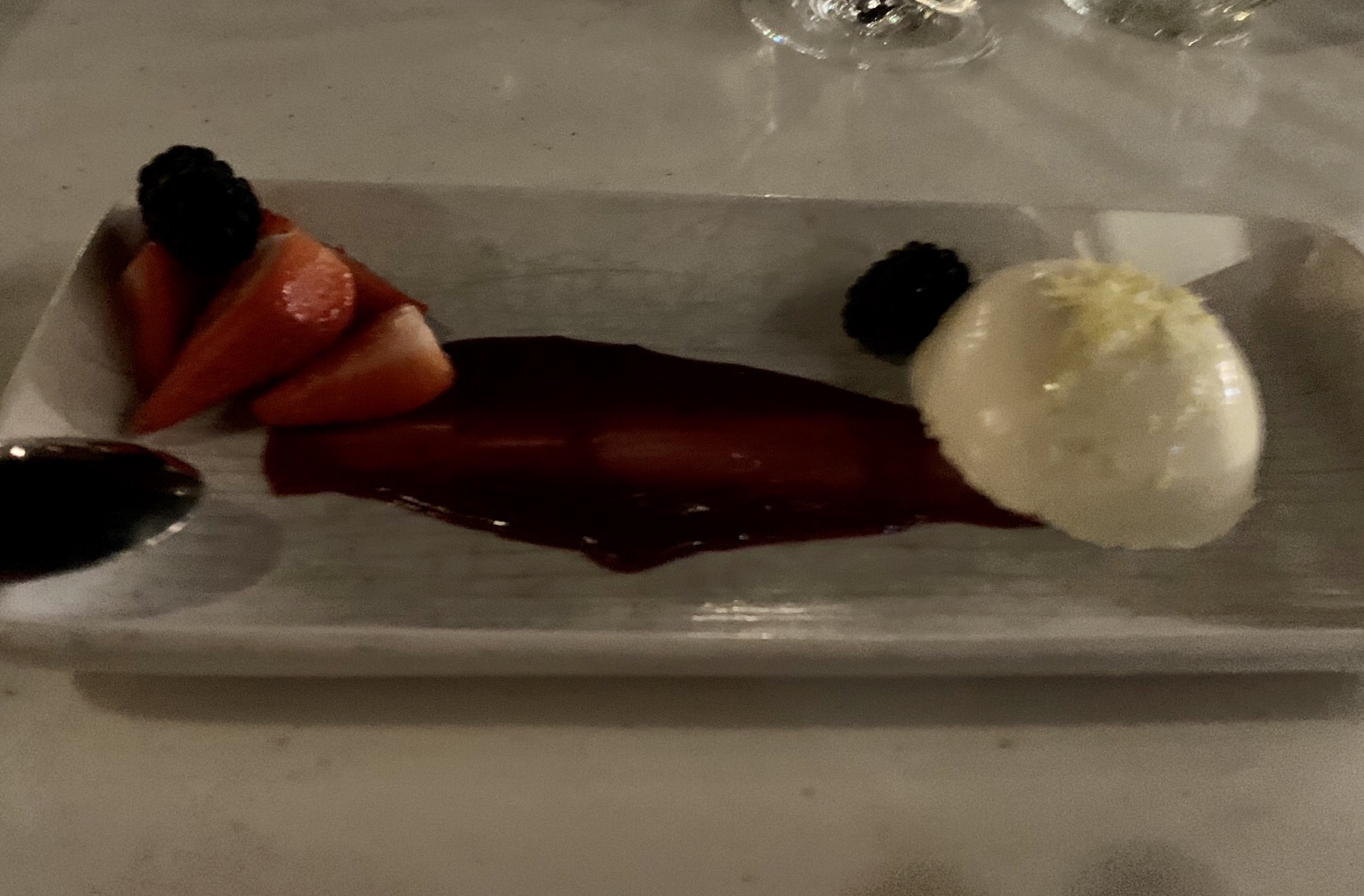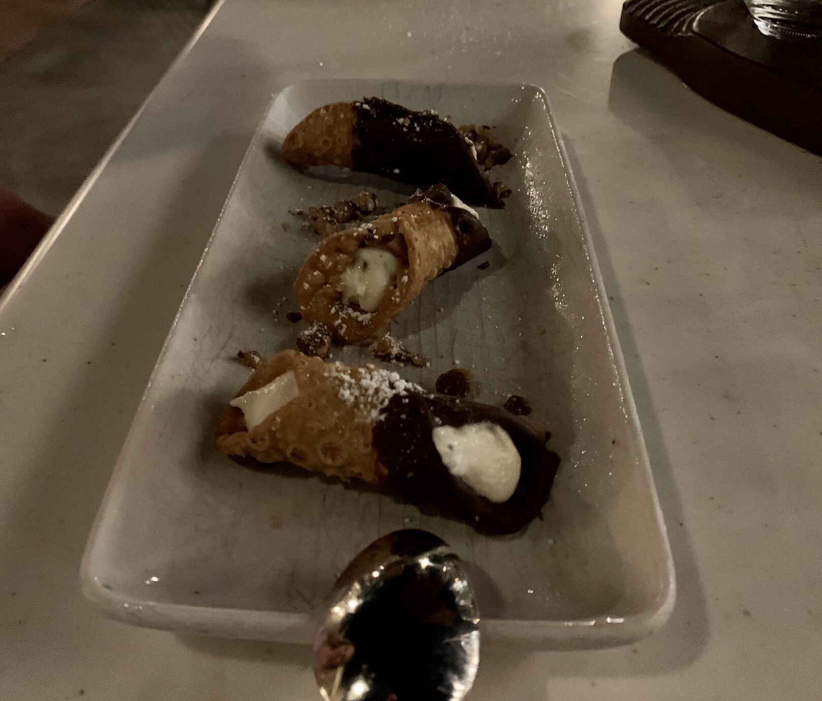 There was an extra ordinarily long wait between our underwhelming meal and when our server appeared again (we joked about a waiter in Palm Beach that always starts off great but then disappears once the food arrives) and it made the experience even more deflating. Neither one of us had any wine or water left when he came back (not great service). For dessert, my wife ordered the Cannoli and it was good (not great) and I ordered the Lemon Panna Cotta with candied thyme which was amazing and we both fought for every bite.