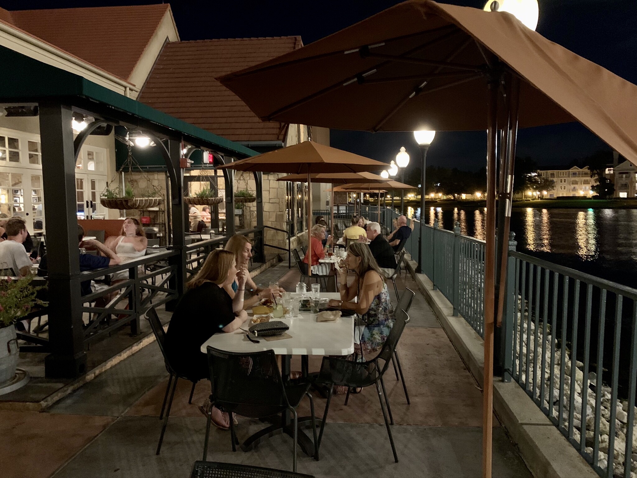 The parking is easy with parking around the area as well as several relatively new parking complexes that tell you how many spaces are available in each level and row. Tonight, we decided it was easier to take a Lyft and it’s a good thing we did because there are huge lines of cars waiting to get into the parking garages on Friday evenings. Save yourself the time and aggravation if you can and get a Lyft. They drop you off on the east side so you also get to enjoy the walk past the grand stage (which often has live music) and we would recommend you take a walk past Rainforest café (with a huge fireball volcano) and across the beautiful marketplace bridge.